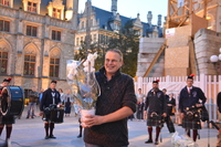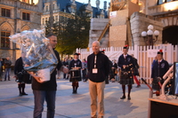 | Slotconcert op 25 augustus 2018 met beiaard, pipes and drums. Stadsbeiaardier heeft een bloemetje klaar voor Jan Sintobin, die paraat was bij elk concert.