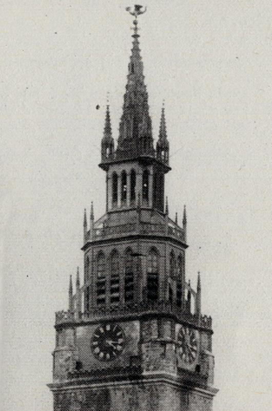 De gietijzerenspits van het belfort zoals die eruit zag in op het einde van de 19de eeuw. Deze moest omwille van corrosie verwijderd worden en werd vervangen door de huidige spits.