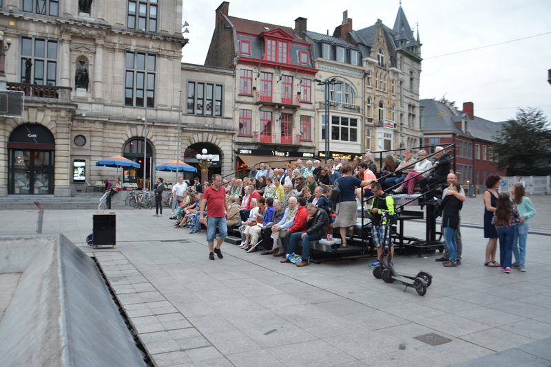Aperitiefconcert op 18 augustus 2018. Toehoorders kijken naar het scherm waar ze de beiaardier aan het werk kunnen zien.