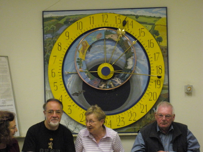 Enkele van de genodigden onder een astronomisch uurwerk.
