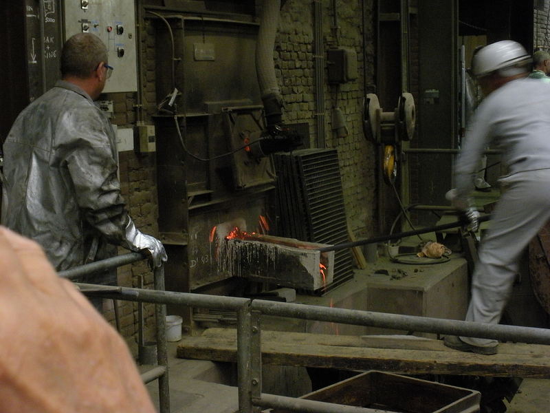Eerst met een drilboor, dan met een ijzeren stang, wordt de prop die het brons in de oven moet tegenhouden, stuk voor stuk afgebroken. De prop is bijna doorgebroken. Er komen al wat gensters uit.